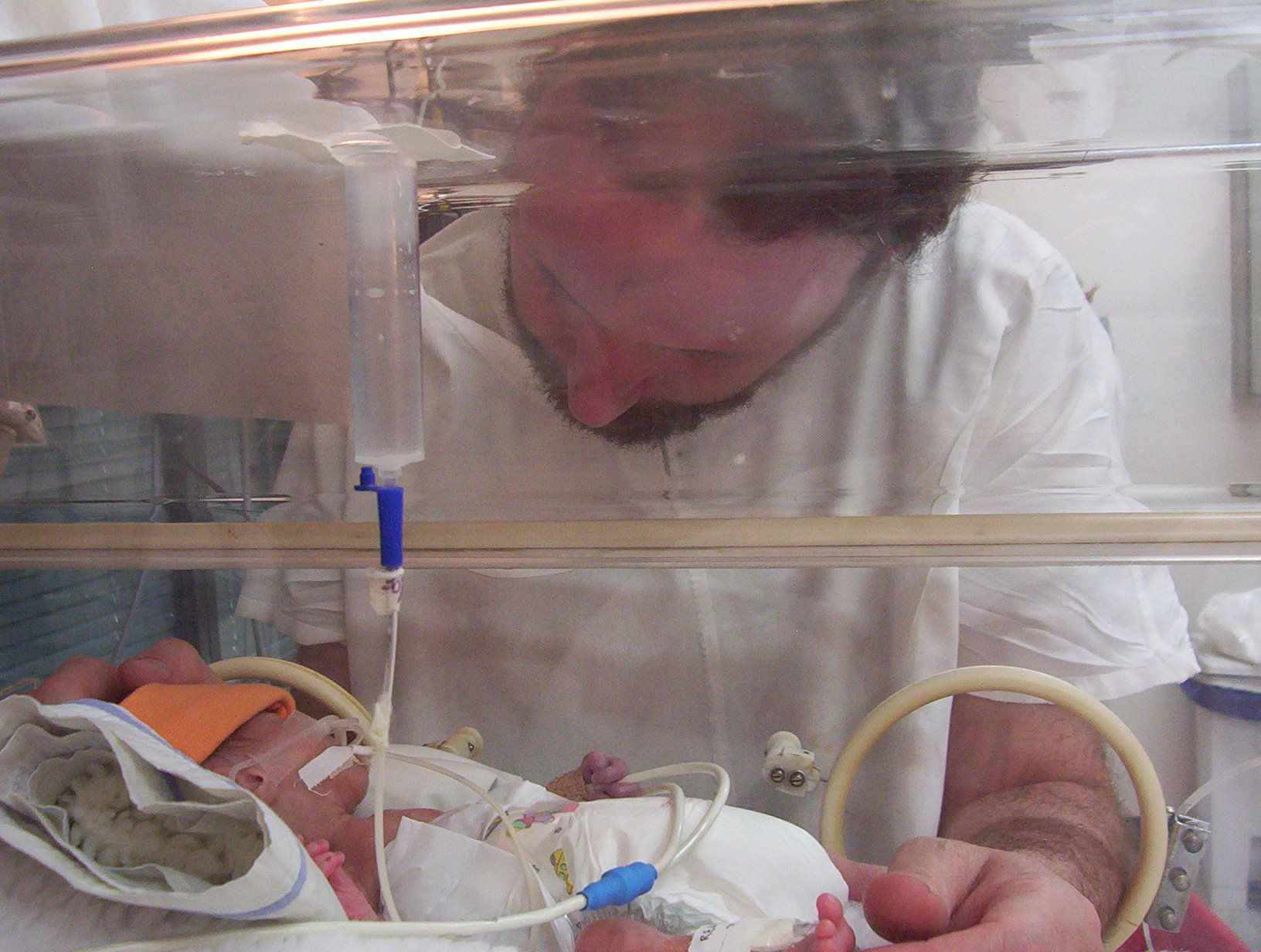Bas nos dijo que podíamos tenerlo a Pedro una o dos veces por día, si estaba todo bien, y entonces juntamos coraje y le pedimos a las enfermeras si podría ser, y nos dijeron que dependía del servicio, pero que en principio sí; cuando fuimos a las nueve Natalia (una enfermera que yo pensaba era muy fría y/o estricta, pero era sólo muy tímida, aparentemente) lo cambió y nos lo dejó tener en brazos quince minutos (que se hicieron media hora), justo antes de que le dieran de comer. Sigue tolerando la leche bien, pero solamente si se la dan muy despacito; trataron de dársela por gravedad (que pasa mucho más rápido) y no la toleró. Vagazo.