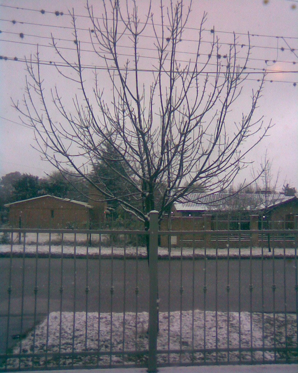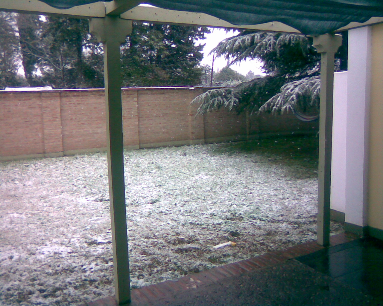 Ha estado nevando hace por lo menos ya un par de horas; se ha juntado en los árboles, los postes, las cercas, y el pasto. Todavía no llega a no derretirse al tocar la vereda, pero tarda varios segundos en desaparecer. Hace mucho frío, y un silencio rarísimo.
